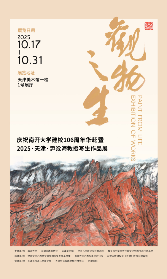 为庆祝南开大学建校106周年华诞,10月17日,由南开大学、天津美术家协会、天津美术馆、中国艺术研究院写意画院、教育部中华优秀传统文化中国书画传承基地主办,中国文学艺术基金会文明互鉴专项基金委、南开大学艺术与美学研究院、云中天传媒投资(天津)股份有限公司承办,天津市书画艺术研究会、天津市金带福路文化传播中心、京徽画院协办的“观物之生——2025·天津·尹沧海教授中国