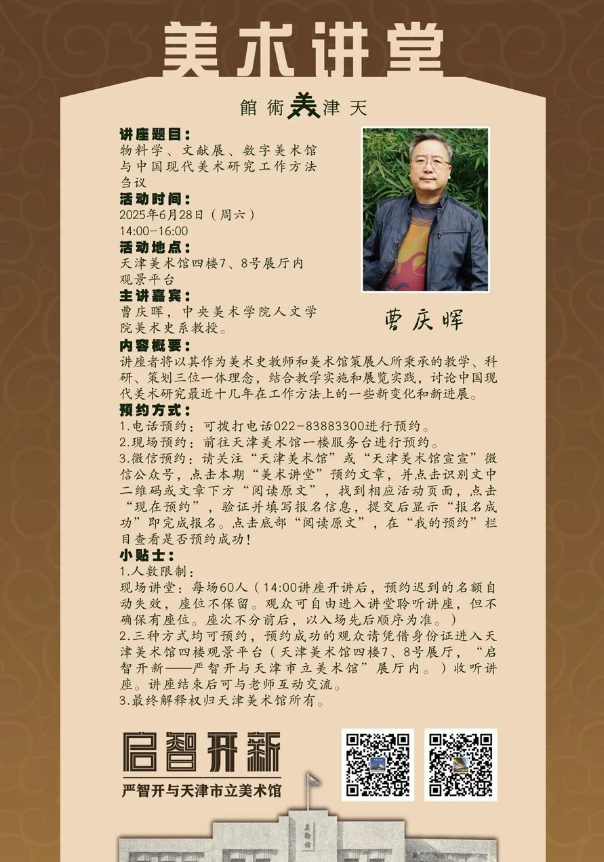 讲座题目:物料学、文献展、数字美术馆与中国现代美术研究工作方法刍议活动时间:2025年6月28日(周六)14:00-16:00活动地点:天津美术馆四楼7、8号展厅内观景平台主讲嘉宾:曹庆晖,中央美